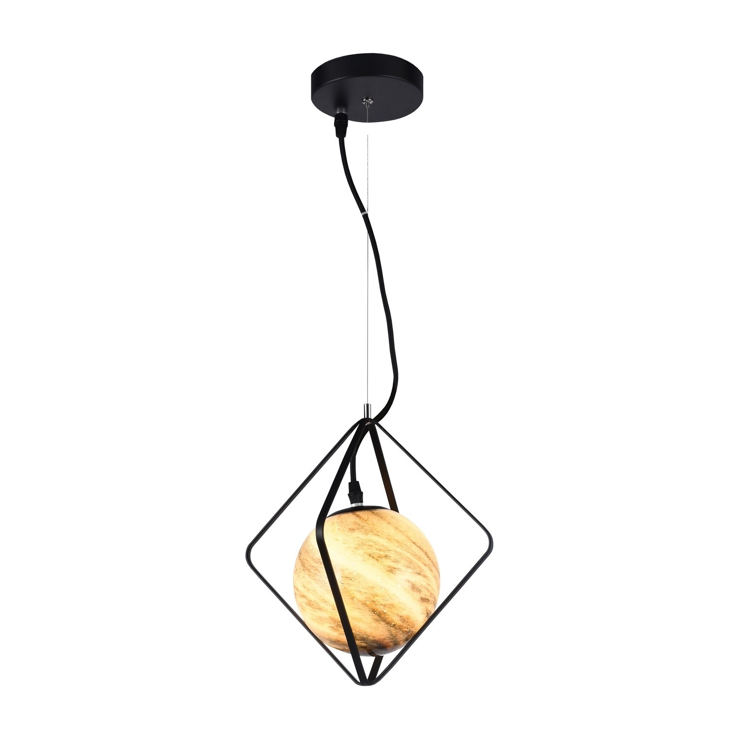 Подвесной светильник G51209/1BK от бренда Gerhort. Каркас выполнен из материала металл, цвет черный. Плафон (светорассеиватель) выполнен из материала стекло, цвет цветной мрамор. Цоколь G9 рассчитан на лампы максимальной мощности до 3 Вт, а максимальная площадь освещения составит до 1 м².