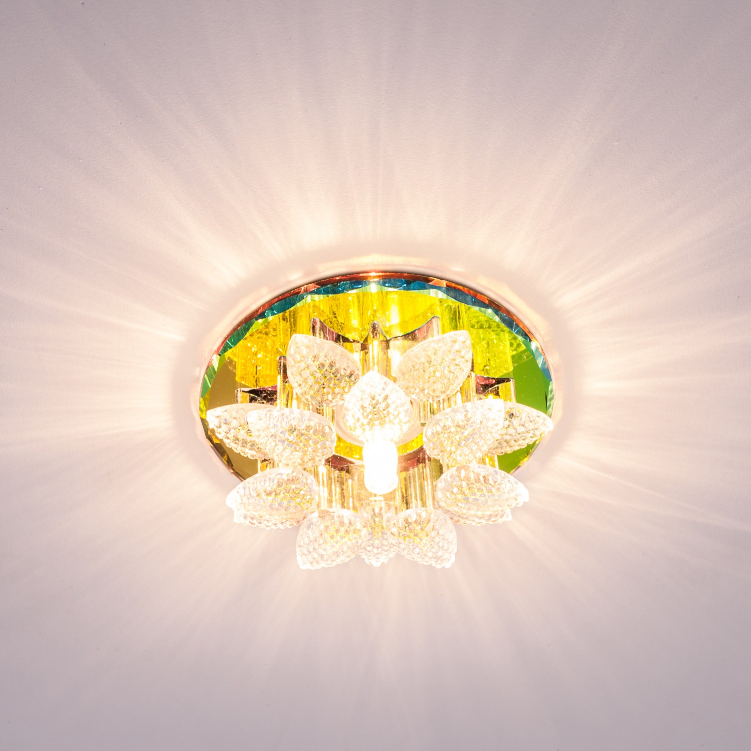 Точечный светильник F5013 RNB+CL GU5.3 от бренда ЭкономСвет. Каркас выполнен из материала стекло, цвет зеркальный цветной. Цоколь G4 рассчитан на лампы максимальной мощности до 35 Вт, а максимальная площадь освещения составит до 3 м².